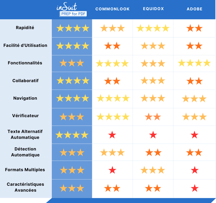 inSuit PREP for PDF™ est une plateforme qui utilise l’Intelligence Artificielle (IA) pour automatiser la remédiation des documents PDF, Microsoft Word, des pages scannées et d’autres formats, les rendant accessibles aux utilisateurs de logiciels de lecture d’écran. Elle offre: